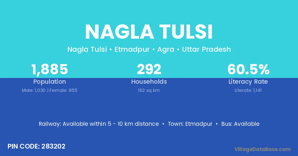Mathura (25 km) is the nearest town to Nagla Tulsi village for major economic activities and is located approximately 25 km away.