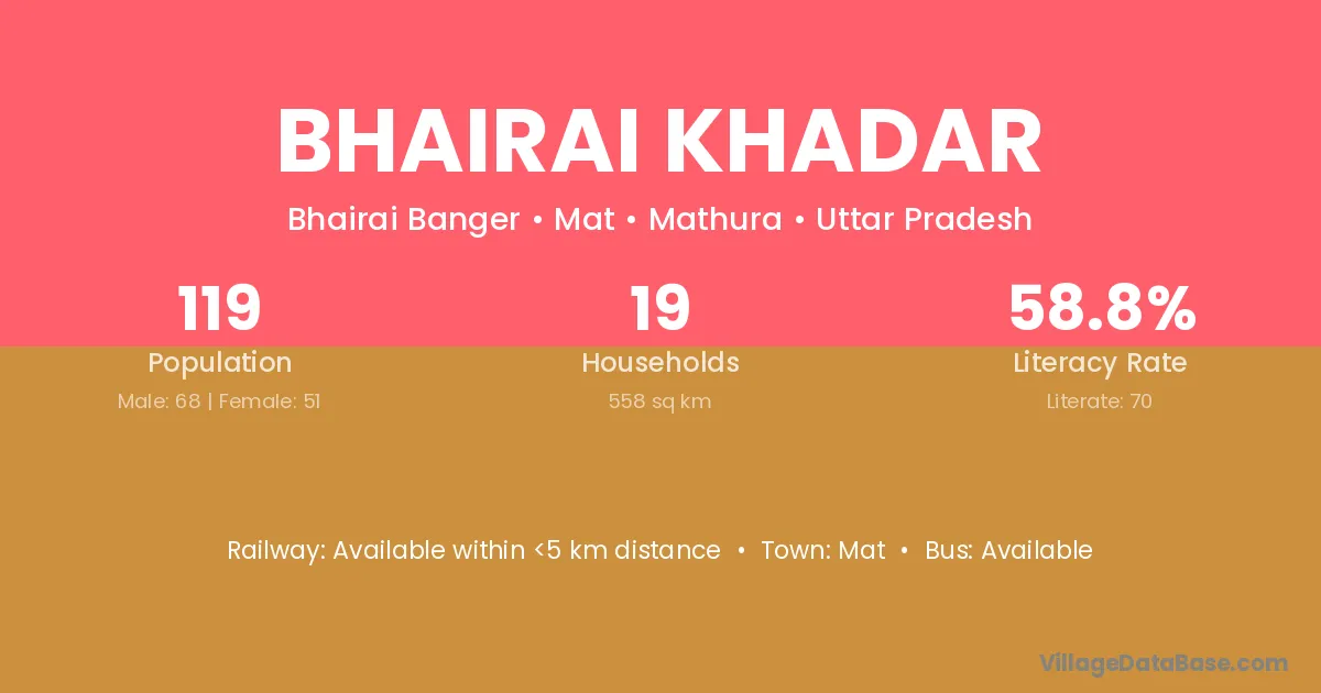 Bhairai Khadar village has a total population of 119 people, of which 68 are males and 51 are females.