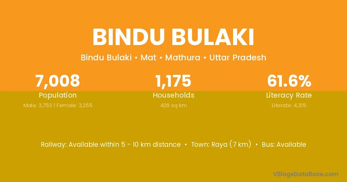 Raya (7 km) is the nearest town to Bindu Bulaki village for major economic activities and is located approximately 7 km away.