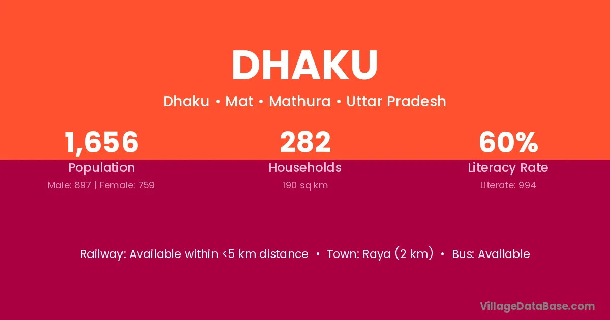 Raya (2 km) is the nearest town to Dhaku village for major economic activities and is located approximately 2 km away.