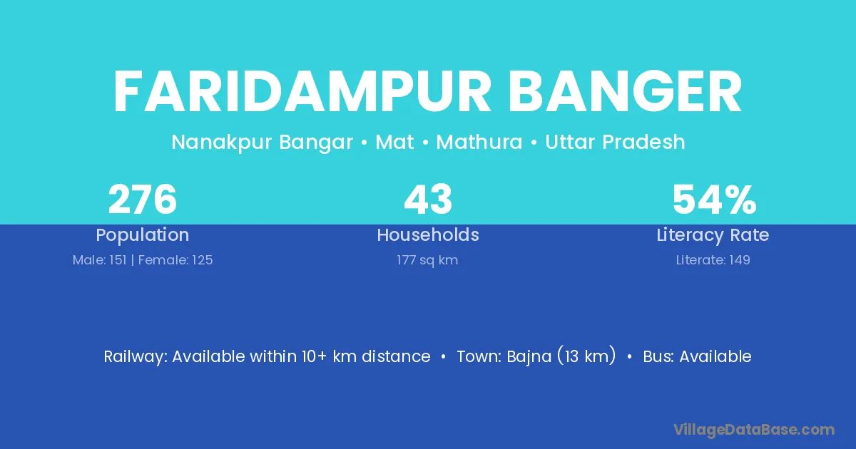 Bajna (13 km) is the nearest town to Faridampur Banger village for major economic activities and is located approximately 13 km away.
