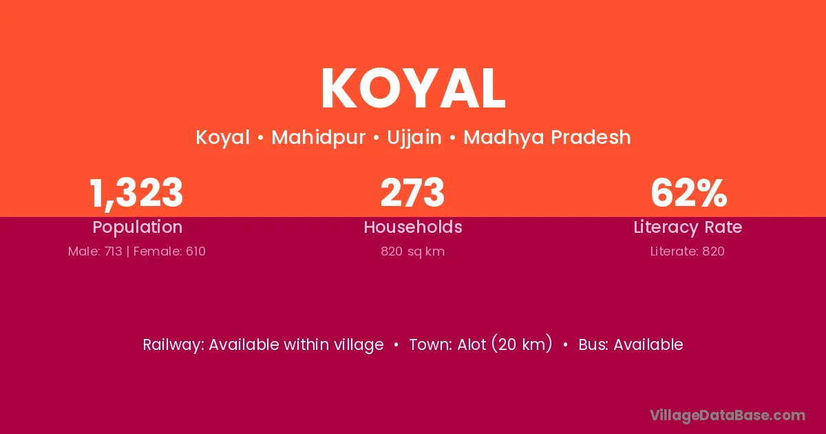 The literacy rate of Koyal village is 62.92%. Male literacy stands at 72.80% and female literacy at 52.07%.