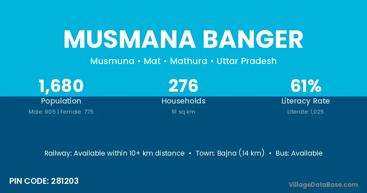Bajna (14 km) is the nearest town to Musmana Banger village for major economic activities and is located approximately 14 km away.