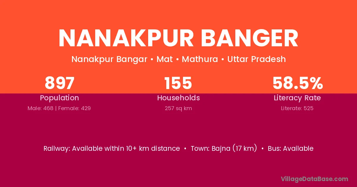 Bajna (17 km) is the nearest town to Nanakpur Banger village for major economic activities and is located approximately 17 km away.