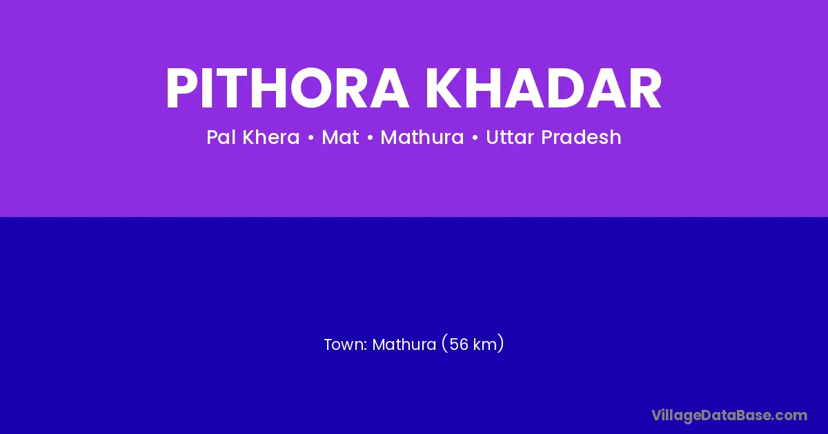 Mathura (56 km) is the nearest town to Pithora Khadar village for major economic activities and is located approximately 56 km away.