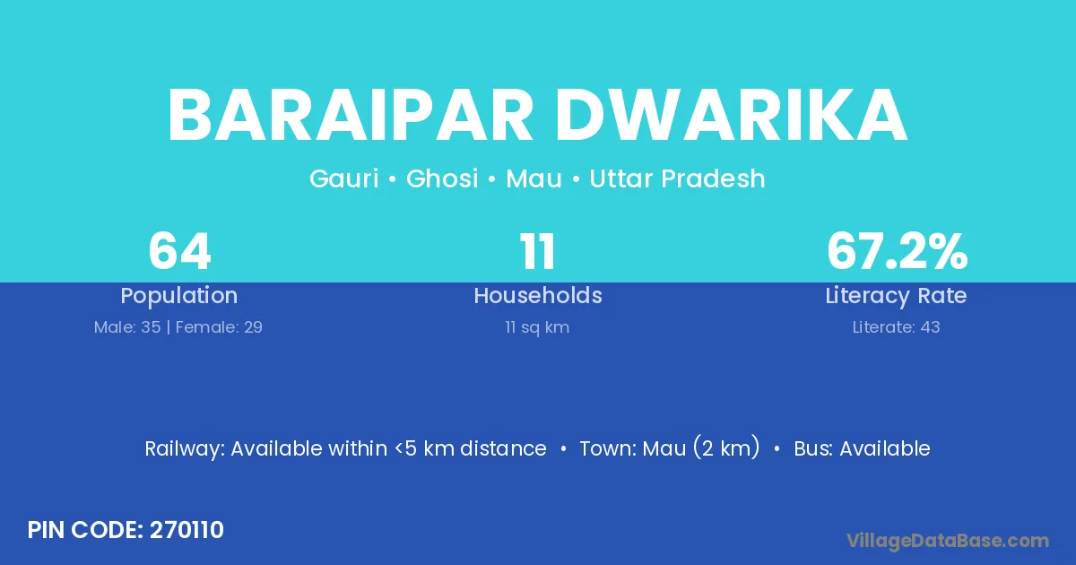 Mau (2 km) is the nearest town to Baraipar Dwarika village for major economic activities and is located approximately 2 km away.