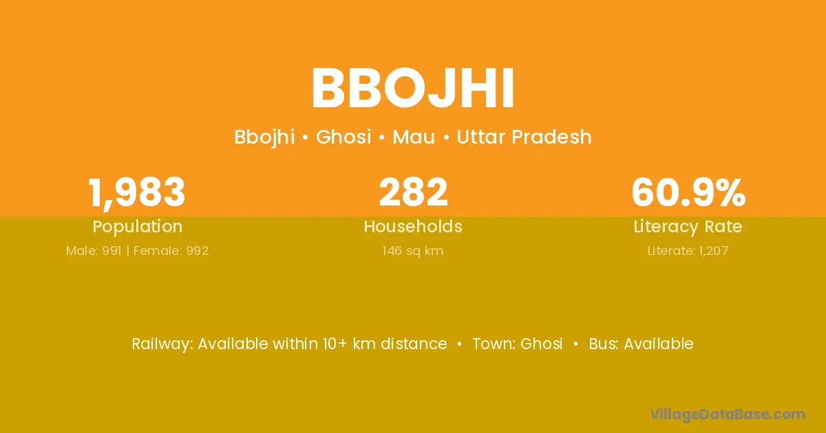 Bbojhi village has a total population of 1,983 people, of which 991 are males and 992 are females.