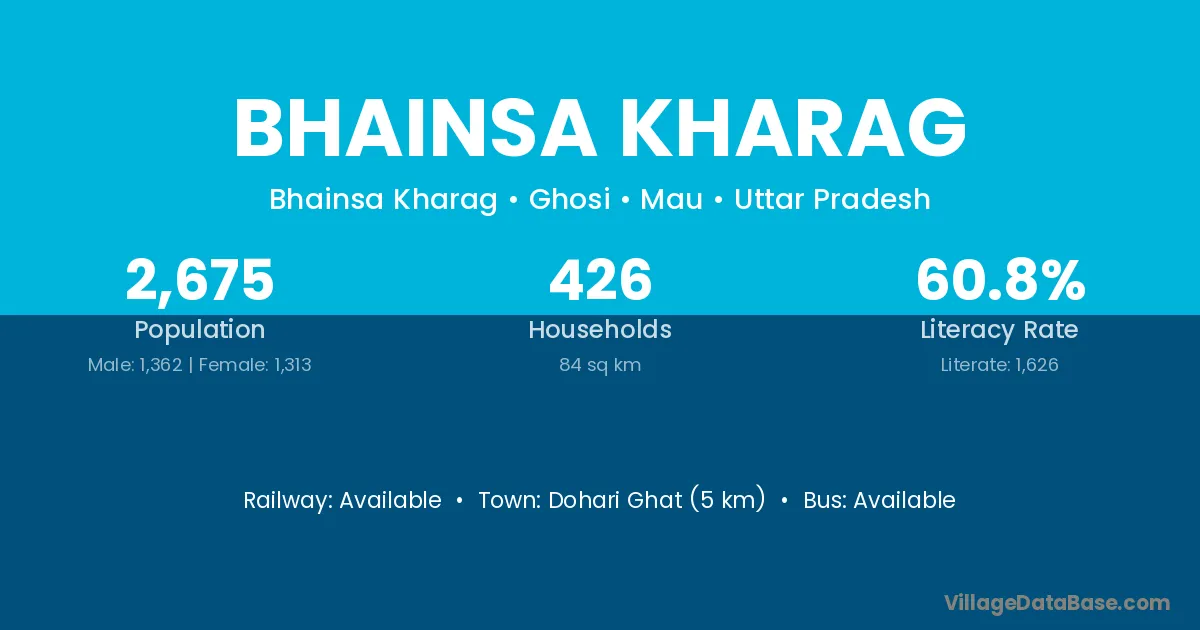 Bhainsa Kharag village has a total population of 2,675 people, of which 1,362 are males and 1,313 are females.