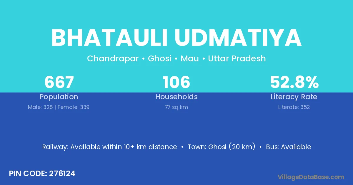 Ghosi (20 km) is the nearest town to Bhatauli Udmatiya village for major economic activities and is located approximately 20 km away.