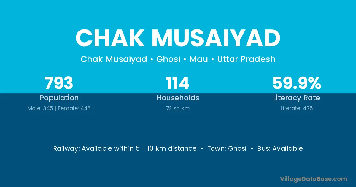 Chak Musaiyad village has a total population of 793 people, of which 345 are males and 448 are females.