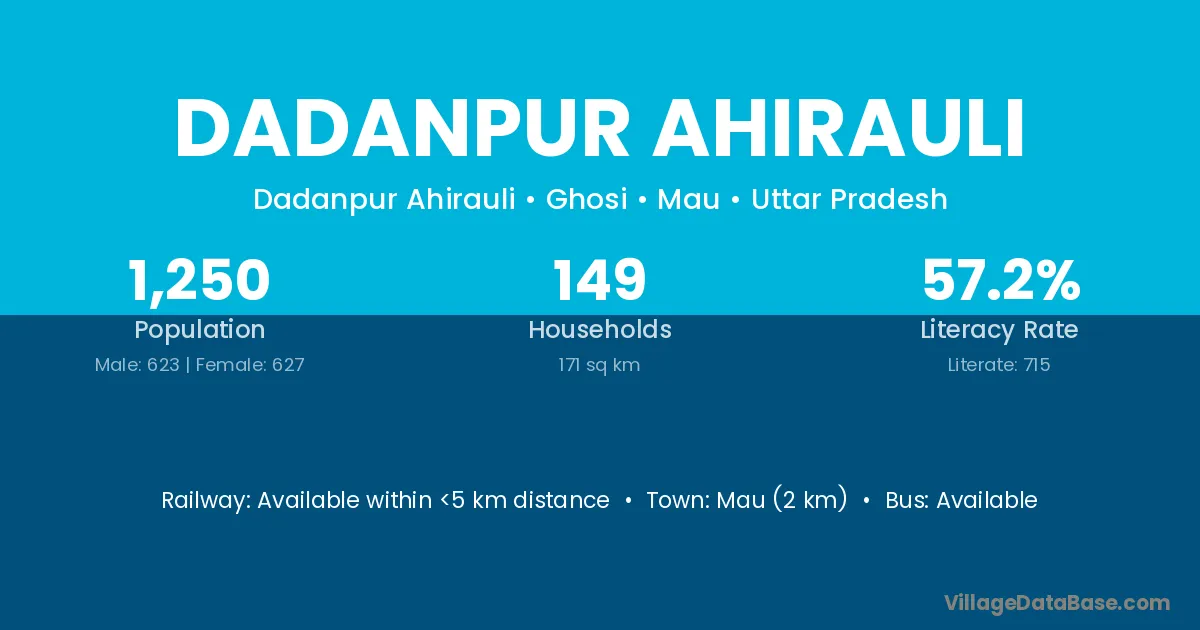 Mau (2 km) is the nearest town to Dadanpur Ahirauli village for major economic activities and is located approximately 2 km away.