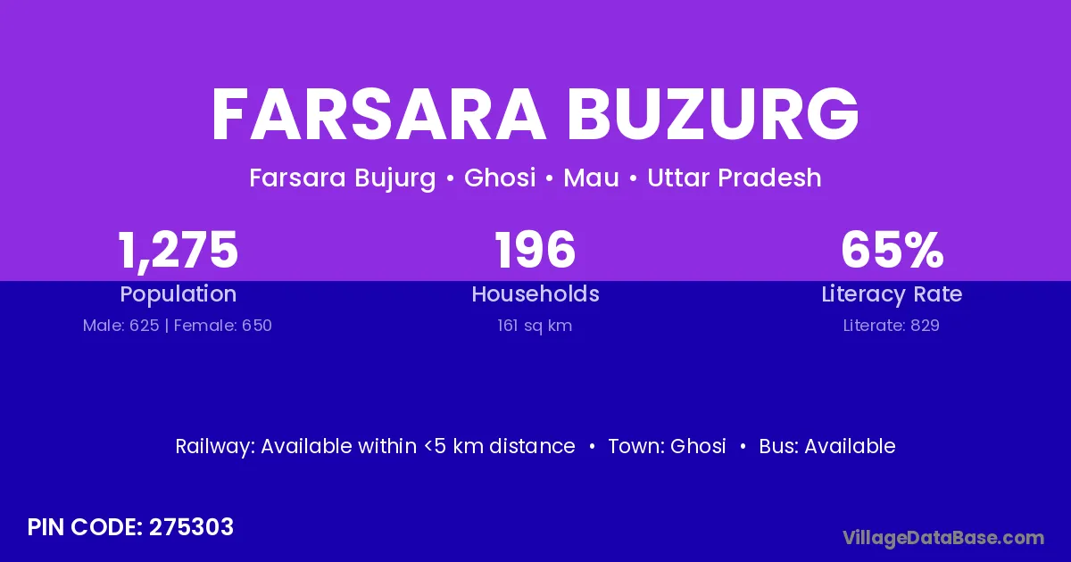 Farsara Buzurg village has a total population of 1,275 people, of which 625 are males and 650 are females.
