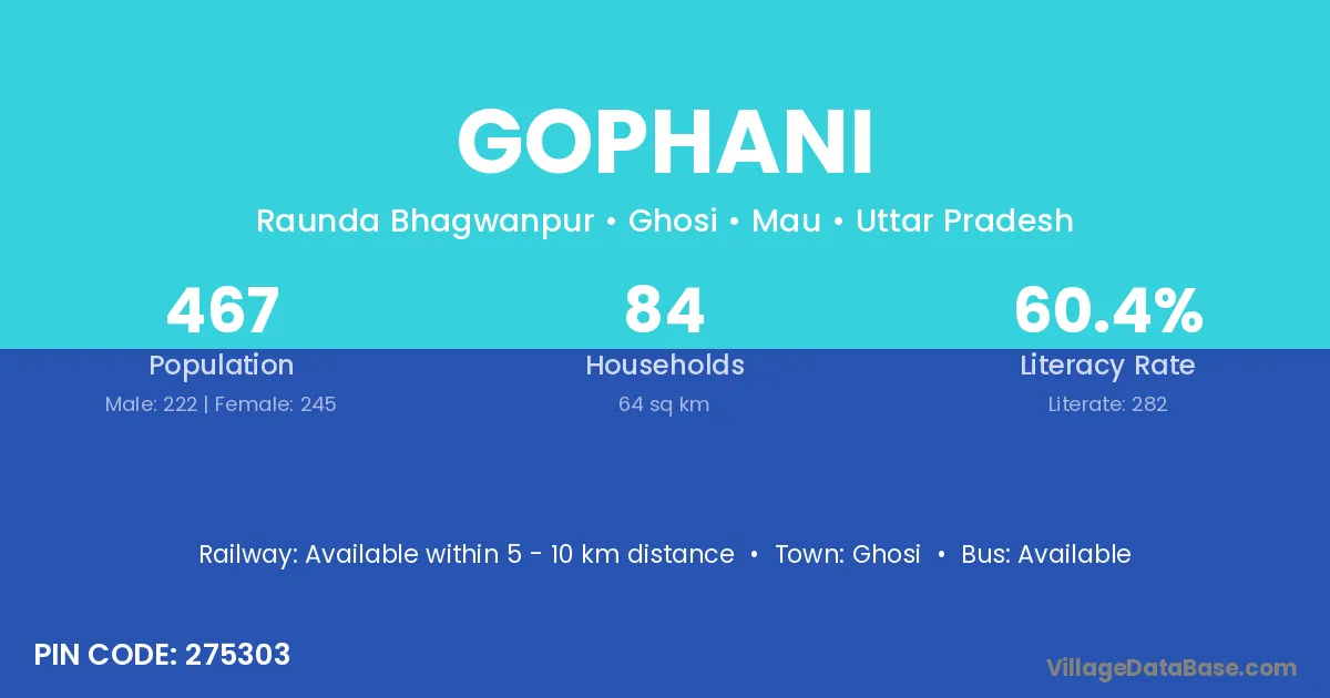Gophani village has a total population of 467 people, of which 222 are males and 245 are females.