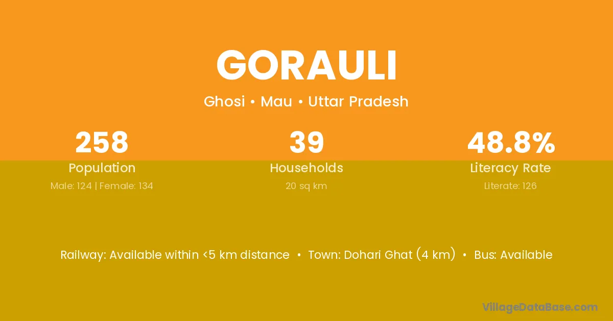 Gorauli village has a total population of 258 people, of which 124 are males and 134 are females.