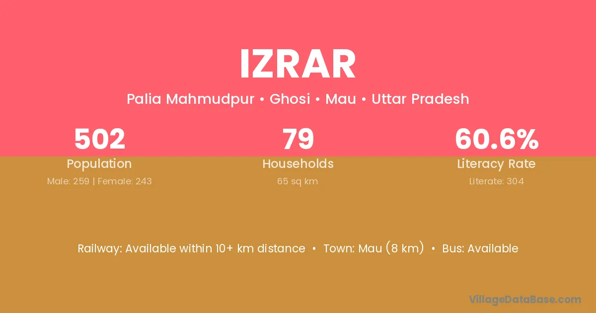 Mau (8 km) is the nearest town to Izrar village for major economic activities and is located approximately 8 km away.