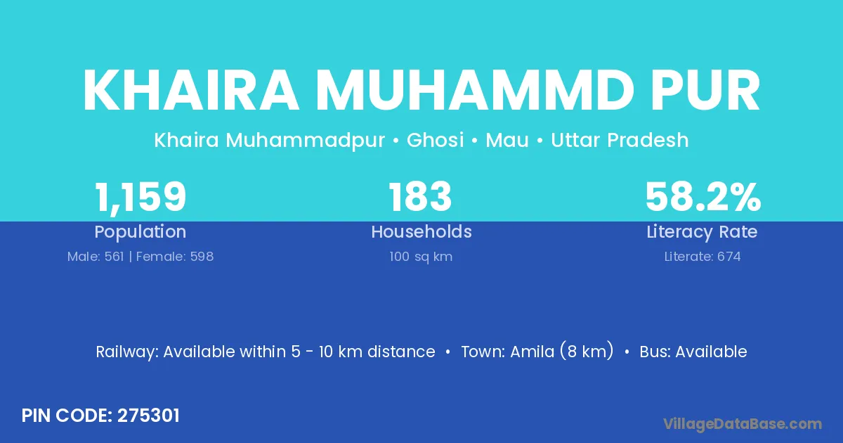 Khaira Muhammd Pur village has a total population of 1,159 people, of which 561 are males and 598 are females.