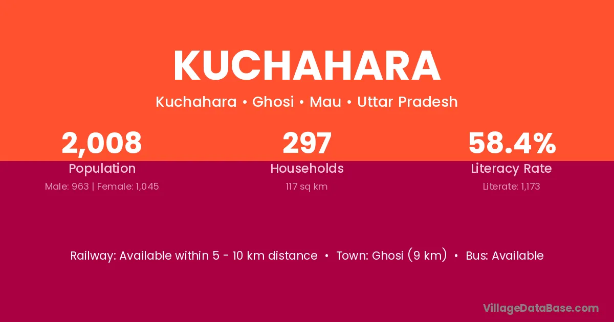 Kuchahara village has a total population of 2,008 people, of which 963 are males and 1,045 are females.