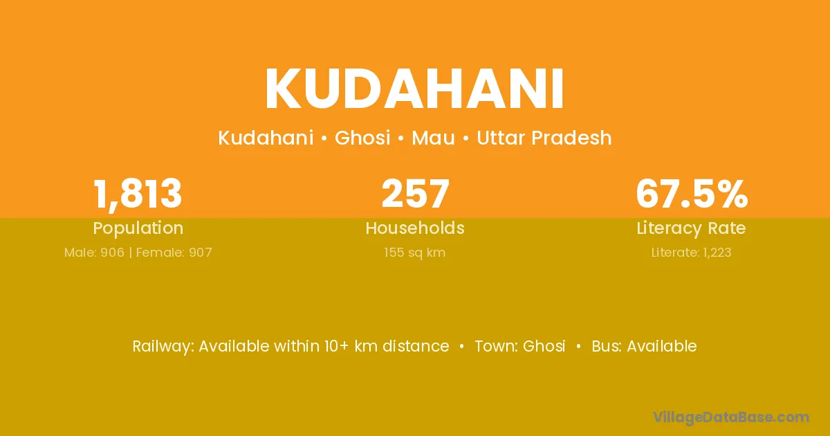 Kudahani village has a total population of 1,813 people, of which 906 are males and 907 are females.