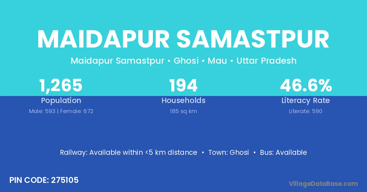 Maidapur Samastpur village has a total population of 1,265 people, of which 593 are males and 672 are females.