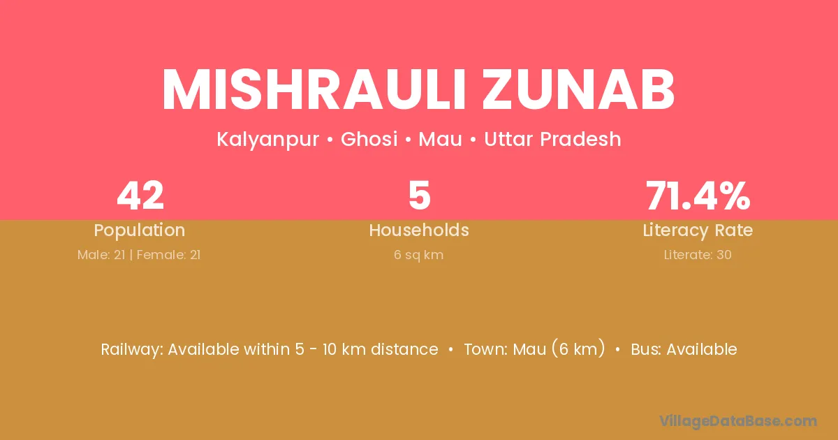 Mishrauli Zunab village has a total population of 42 people, of which 21 are males and 21 are females.