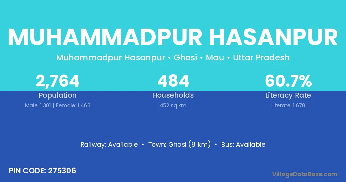 Ghosi (8 km) is the nearest town to Muhammadpur Hasanpur village for major economic activities and is located approximately 8 km away.