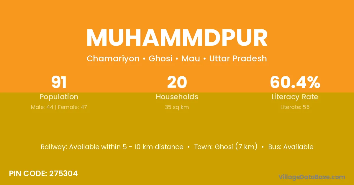 Ghosi (7 km) is the nearest town to Muhammdpur village for major economic activities and is located approximately 7 km away.