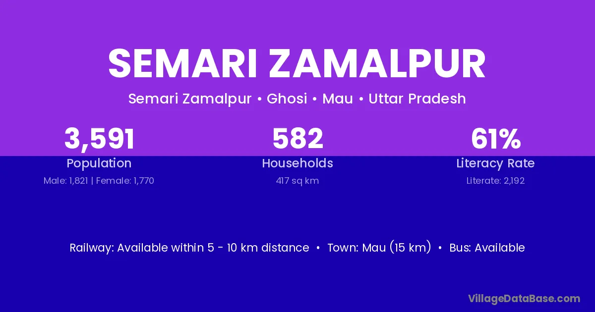 Mau (15 km) is the nearest town to Semari Zamalpur village for major economic activities and is located approximately 15 km away.