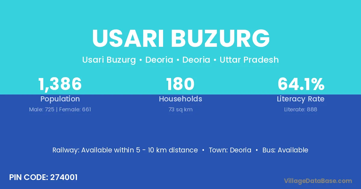 The literacy rate of Usari Buzurg village is 63.69%. Male literacy stands at 64.29% and female literacy at 63.18%.