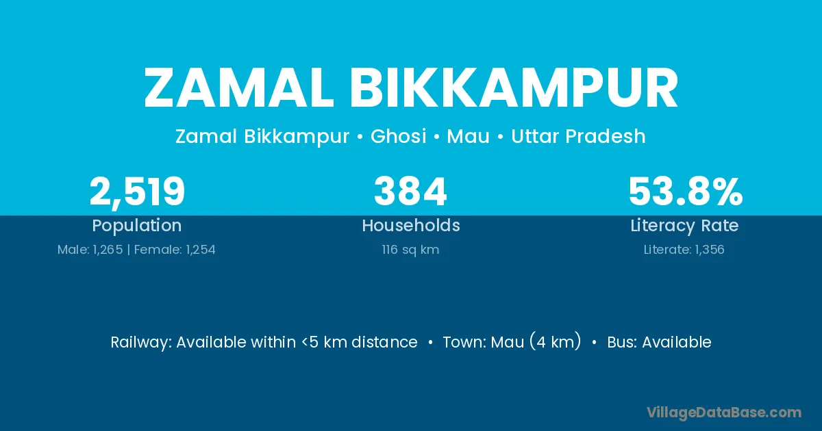 Mau (4 km) is the nearest town to Zamal Bikkampur village for major economic activities and is located approximately 4 km away.
