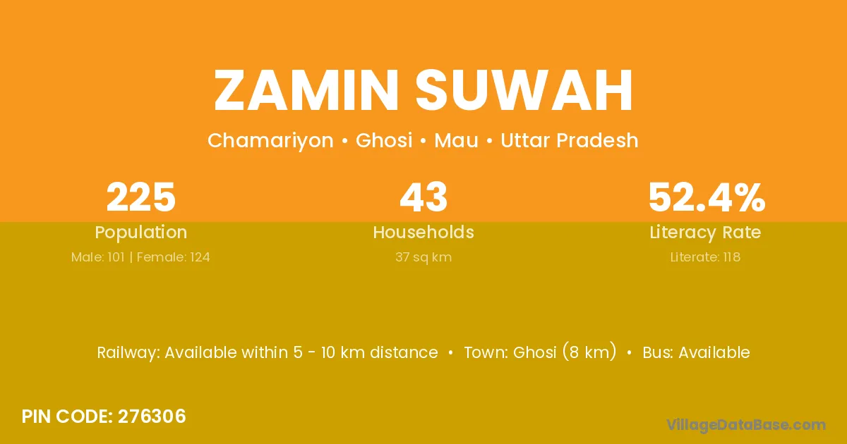 Ghosi (8 km) is the nearest town to Zamin Suwah village for major economic activities and is located approximately 8 km away.