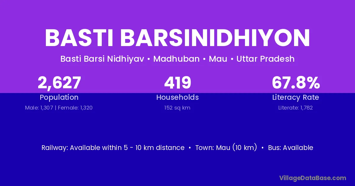 Mau (10 km) is the nearest town to Basti Barsinidhiyon village for major economic activities and is located approximately 10 km away.