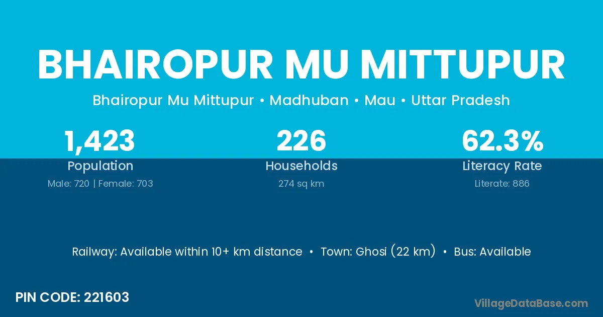 Ghosi (22 km) is the nearest town to Bhairopur Mu Mittupur village for major economic activities and is located approximately 22 km away.