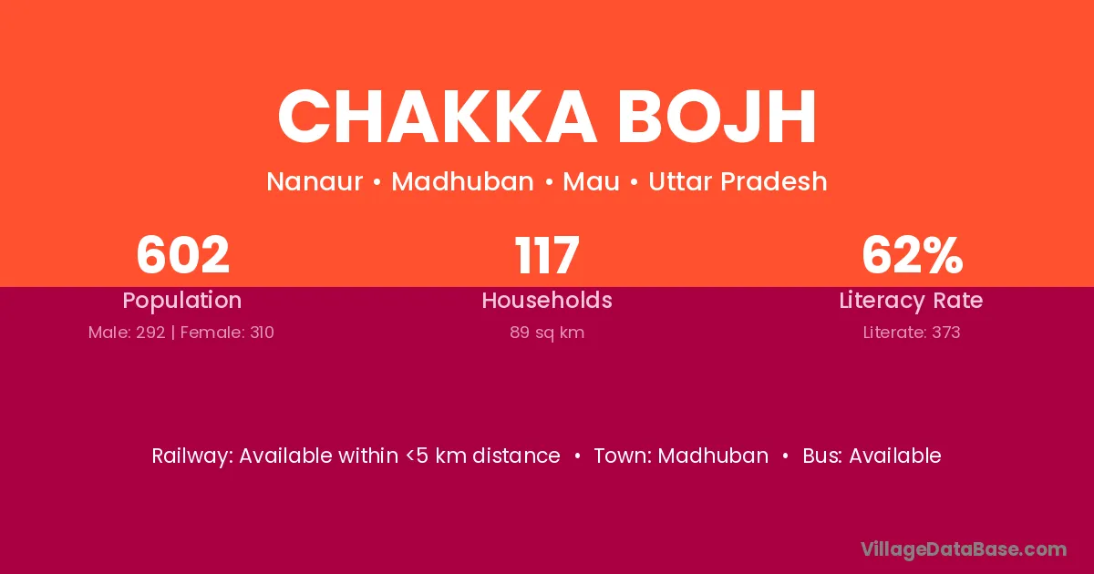 Chakka Bojh village has a total population of 602 people, of which 292 are males and 310 are females.