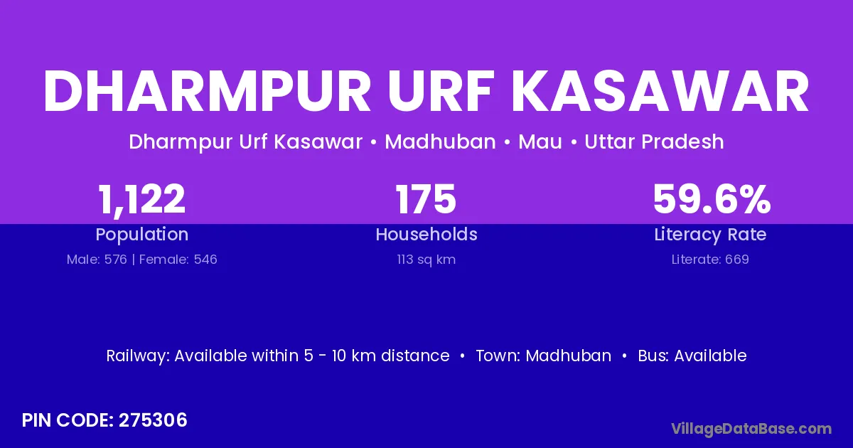 Dharmpur Urf Kasawar village has a total population of 1,122 people, of which 576 are males and 546 are females.