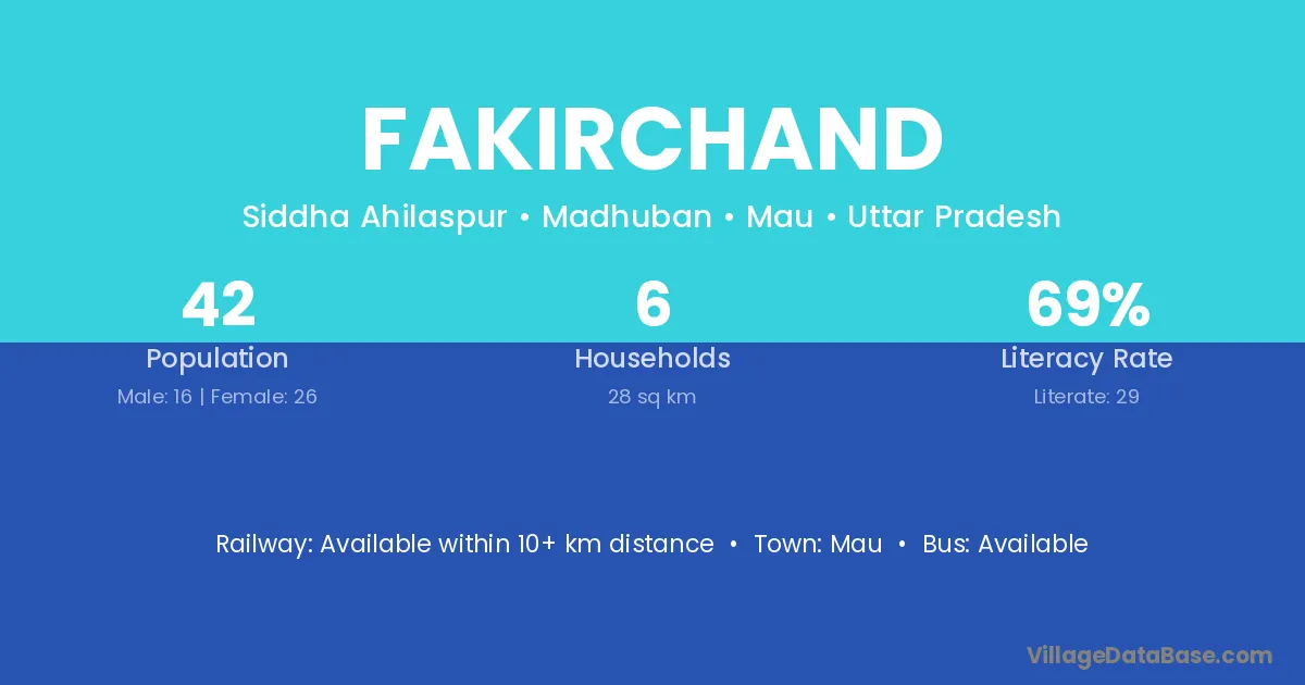 Fakirchand village has a total population of 42 people, of which 16 are males and 26 are females.