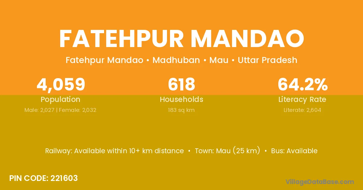 Mau (25 km) is the nearest town to Fatehpur Mandao village for major economic activities and is located approximately 25 km away.