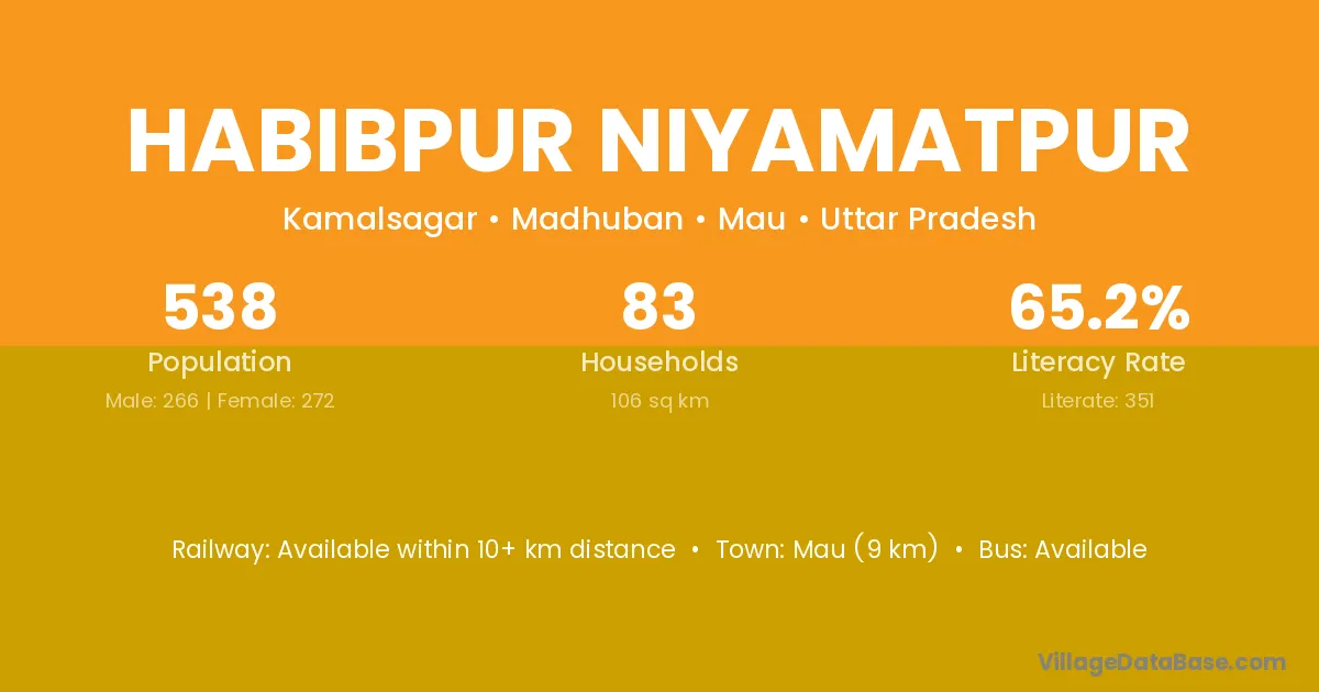 Mau (9 km) is the nearest town to Habibpur Niyamatpur village for major economic activities and is located approximately 9 km away.