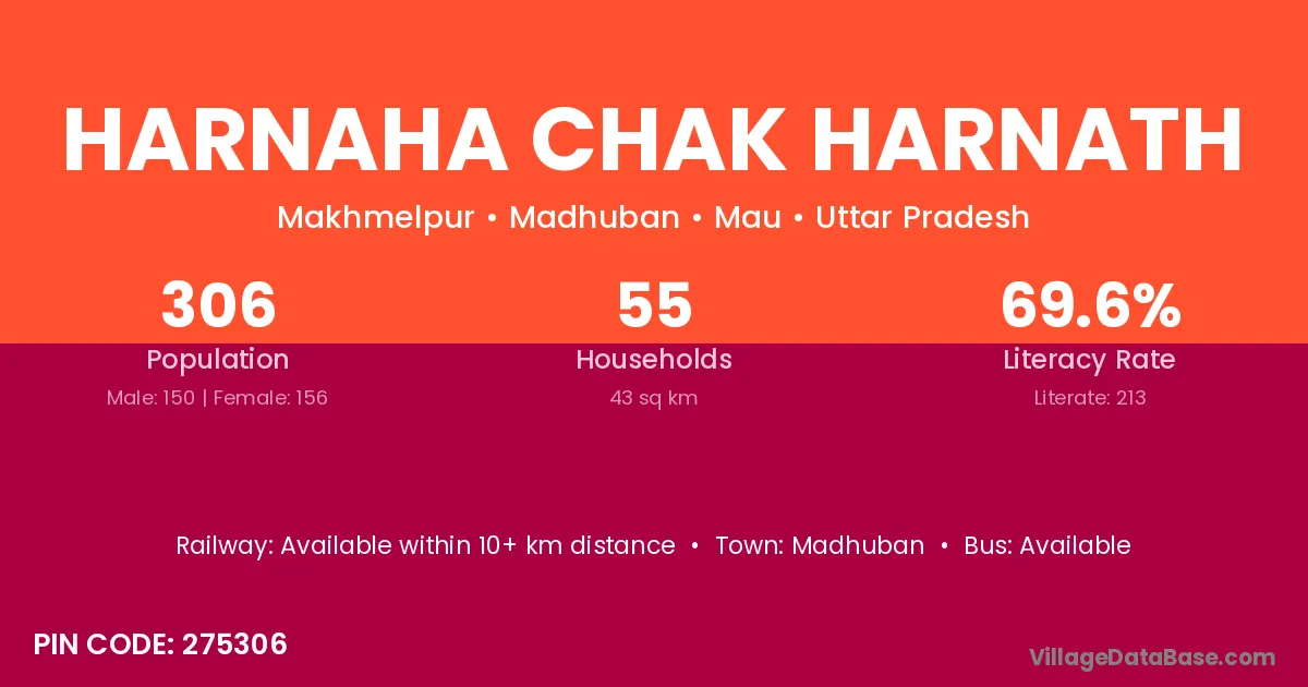 Harnaha Chak Harnath village has a total population of 306 people, of which 150 are males and 156 are females.