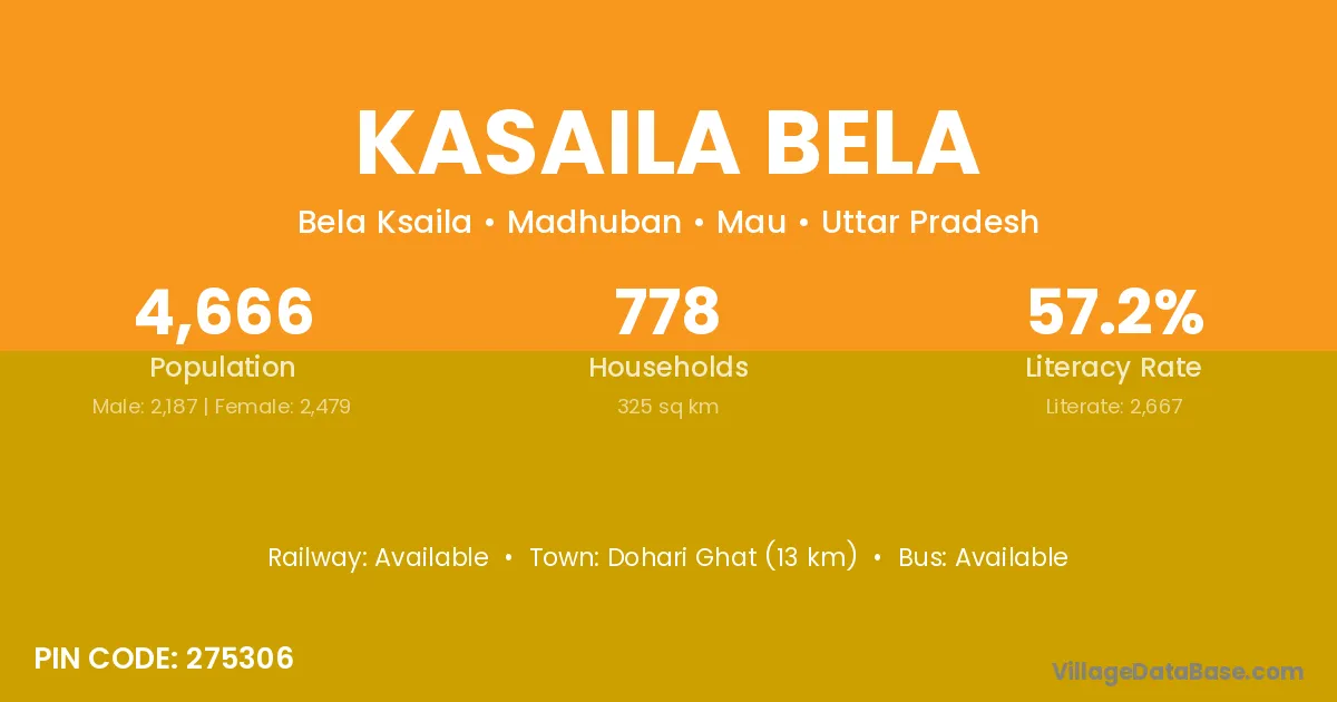 Kasaila Bela village has a total population of 4,666 people, of which 2,187 are males and 2,479 are females.
