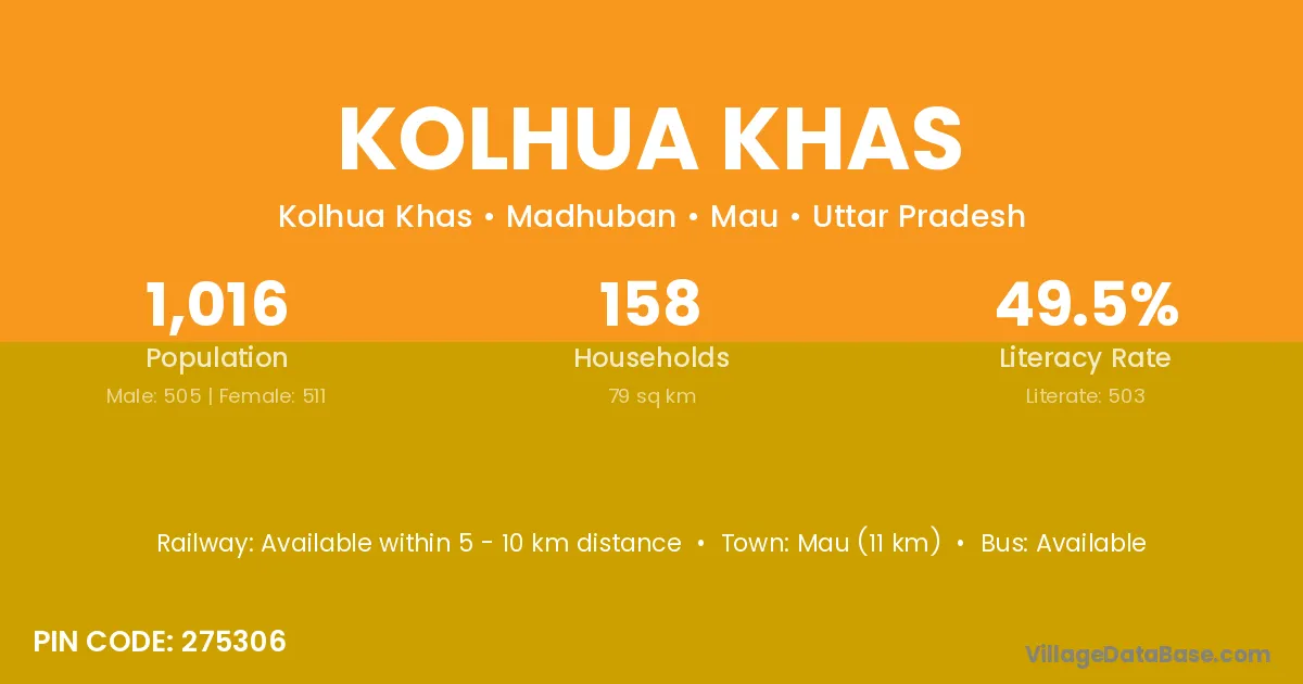 Kolhua Khas village has a total population of 1,016 people, of which 505 are males and 511 are females.