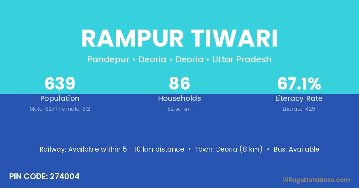 The literacy rate of Rampur Tiwari village is 65.61%. Male literacy stands at 74.17% and female literacy at 57.89%.