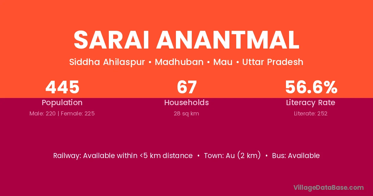 Sarai Anantmal village has a total population of 445 people, of which 220 are males and 225 are females.