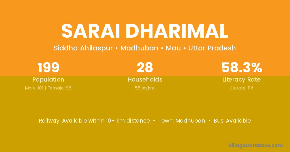 Sarai Dharimal village has a total population of 199 people, of which 101 are males and 98 are females.