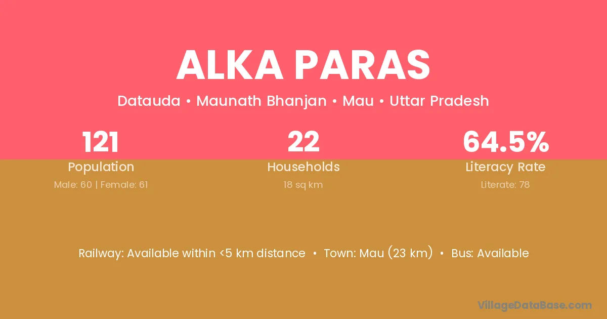 Mau (23 km) is the nearest town to Alka Paras village for major economic activities and is located approximately 23 km away.