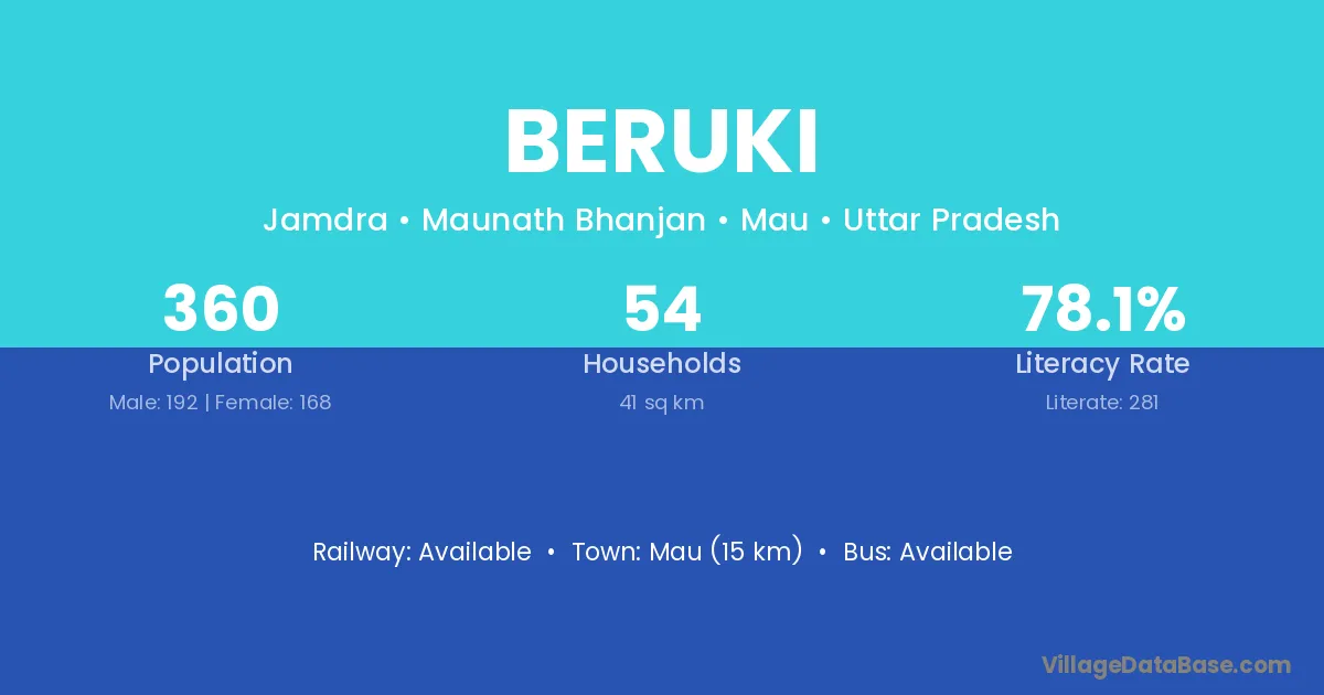 Mau (15 km) is the nearest town to Beruki village for major economic activities and is located approximately 15 km away.
