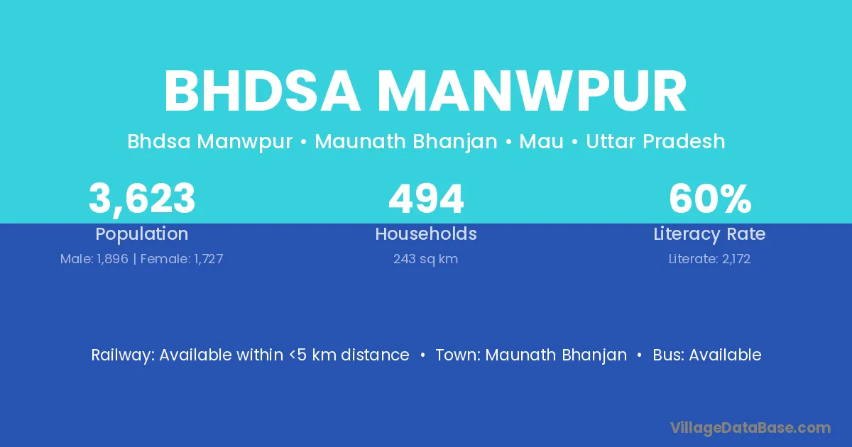 Bhdsa Manwpur village has a total population of 3,623 people, of which 1,896 are males and 1,727 are females.