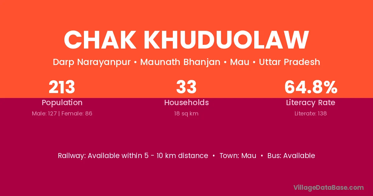 Chak Khuduolaw village has a total population of 213 people, of which 127 are males and 86 are females.