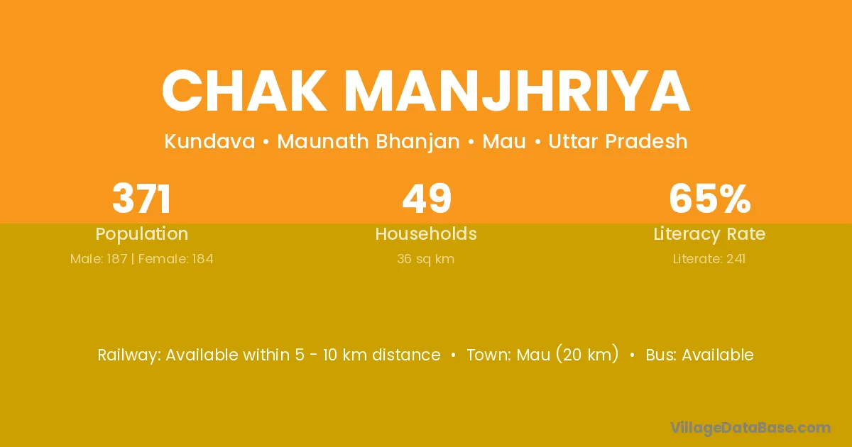 Mau (20 km) is the nearest town to Chak Manjhriya village for major economic activities and is located approximately 20 km away.