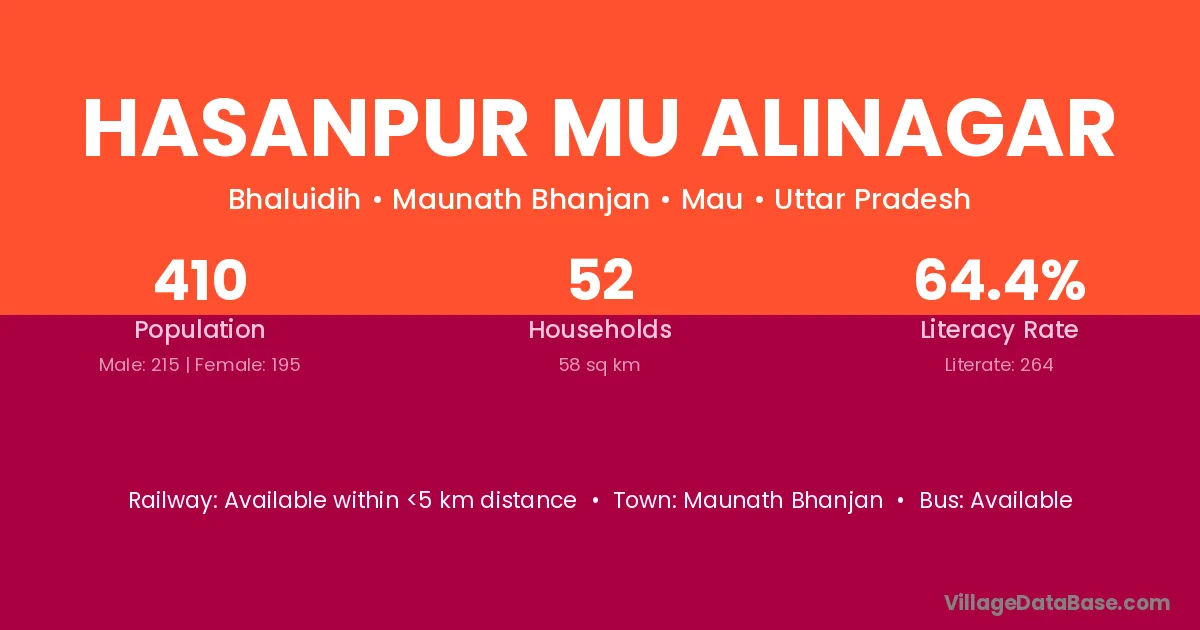 Hasanpur Mu Alinagar village has a total population of 410 people, of which 215 are males and 195 are females.