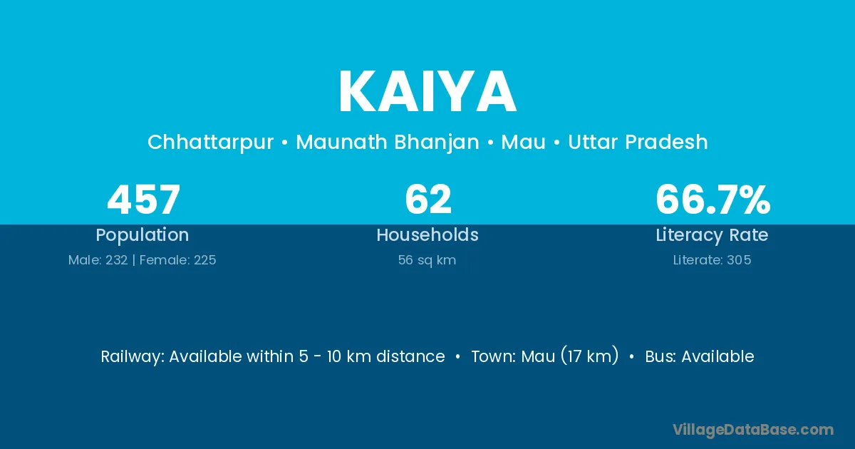 Mau (17 km) is the nearest town to Kaiya village for major economic activities and is located approximately 17 km away.
